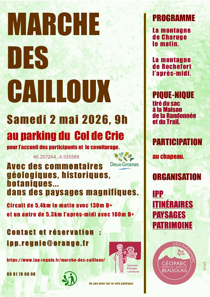 L’association "Itinéraires, Paysages et Patrimoine" vous propose la 13ème Marche des Cailloux" le samedi 2 mai 2026. Départ à à 9h à la Maison de la Randonnée et du Trail au col de Crie à Monsols Deux-Grosnes. Participation au chapeau.