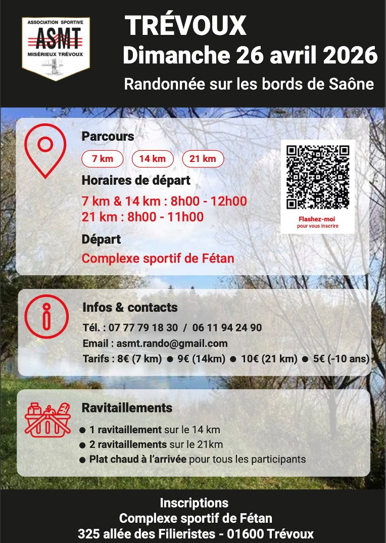 - Inscriptions via le QR code de l’affiche ou au 07 77 79 18 30. HelloAsso : https://www.helloasso.com/associations/assoc-sportive-mizerieux-trevoux/evenements/randonnee-sur-les-bords-de-saone