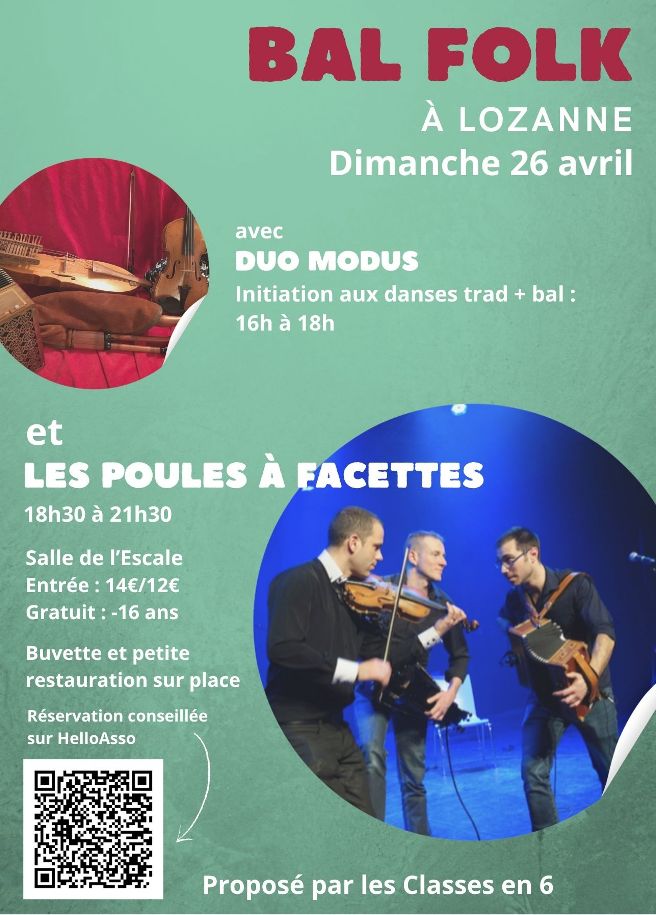 Les Classes en 6 vous propose un bal folk à Lozanne (Salle de l’Escale) le dimanche 26 avril 2026, de 17h à 21h30. Cours d’initiation de 16h à 17h. Suivi d’un bal animé par Duo Modus et Les Poules à facettes. Buvette et petite restauration sur place.