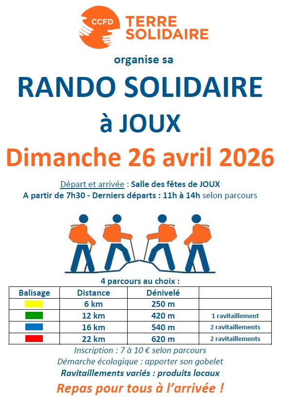 Le CCFD Terre Solidaire-Tarare organise la Randonnée solidaire de Joux le dimanche 26 avril 2026. Départ de de 7h30 et 14h30 à la salle des fêtes de Joux. Prix de participation entre 7€ et 10€. Ravitaillements et repas campagnard à l’arrivée.